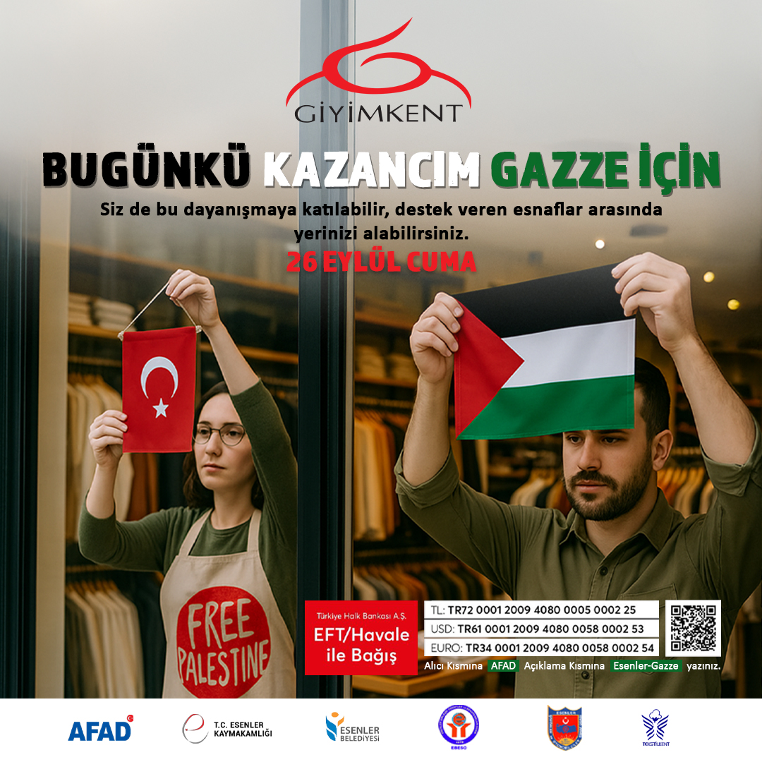 Giyimkent Outlet İndirim Çadırımız, “Bugünkü Kazancım Gazze İçin” kampanyasına destek veriyor. Kampanya kapsamında, 26 Eylül 2025 Cuma günü yapılan tüm satışlardan elde edilen kazanç, Gazze’de yaşanan insani krizden etkilenenlere ulaştırılmak üzere AFAD’ın resmi bağış hesaplarına aktarılacaktır.